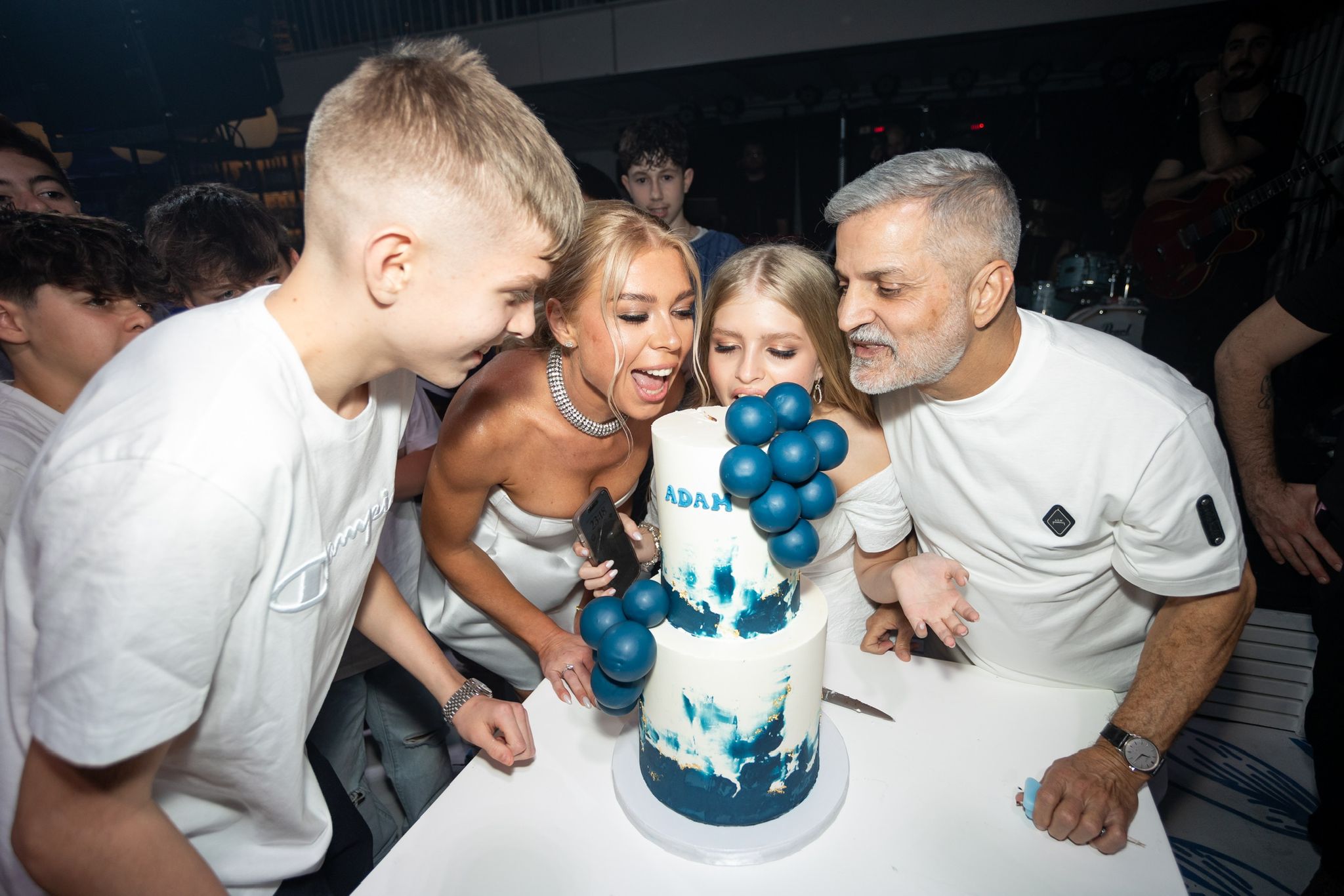 A tech-forward, family-centered celebration: AI-generated visuals and music, a custom memorabilia store for Adam and his friends, interactive games, a powerful entrance moment, gourmet food, and a premium Casa Azul tequila bar for the adults.